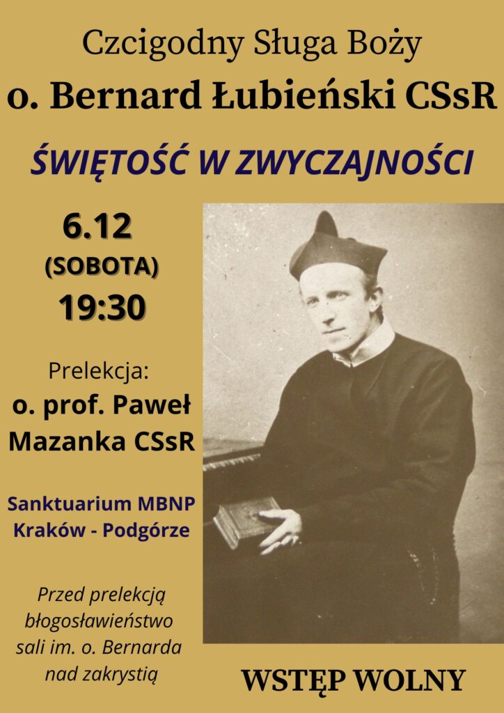 Zapraszamy 6 grudnia, w sobotę o godz. 19:30 (po wieczornej Mszy świętej) na wykład o. Profesora Pawła Mazanki CSsR pt: „Czcigodny Sługa Boży o. Bernard Łubieński CSsR – świętość w zwyczajności”.